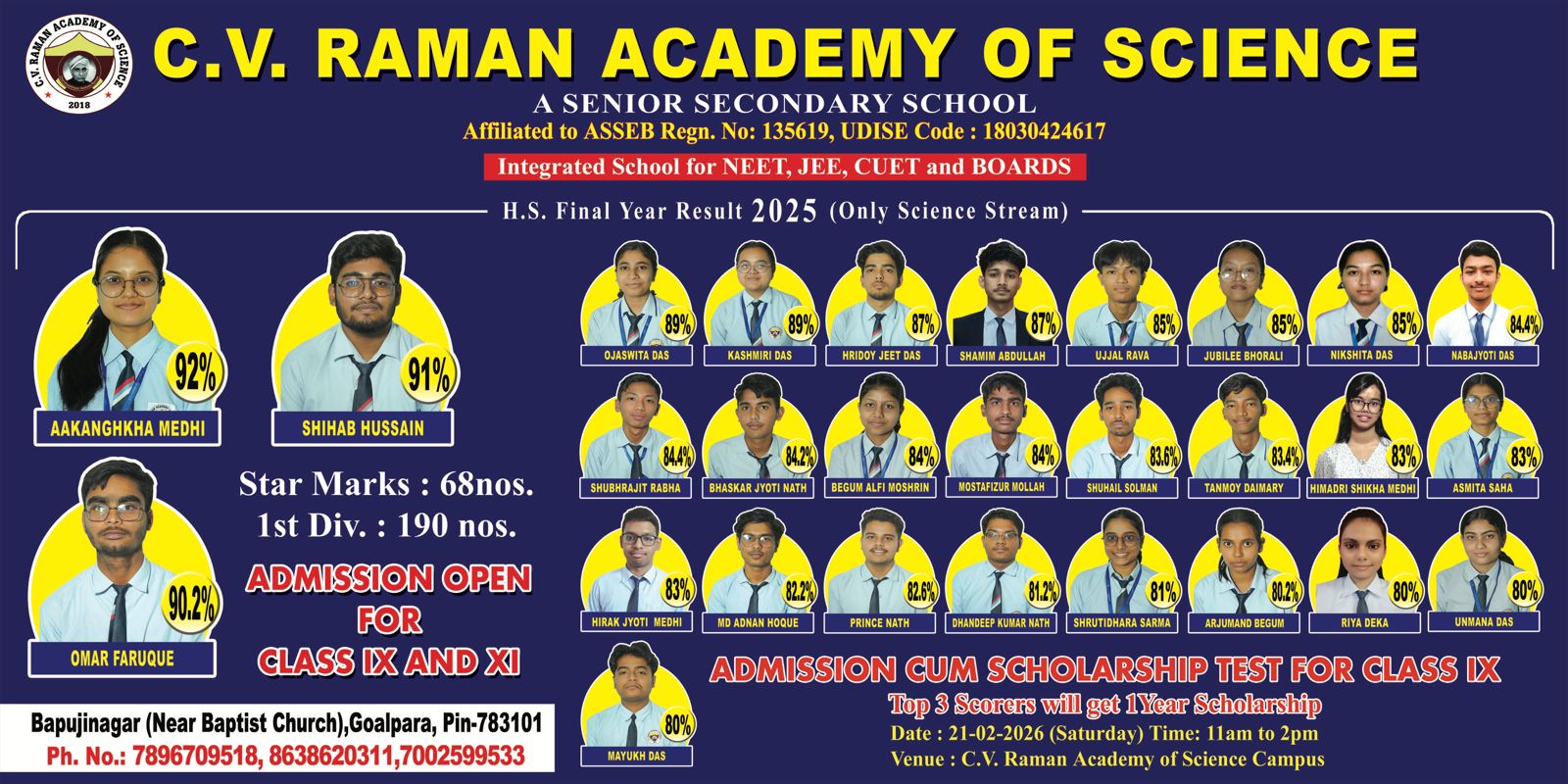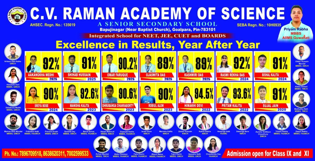C.V. Raman Academy of Science, a well known name of Assam in the field of education, is a co-educational institution which was established in 2018. It is situated at Bapujinagar, in the heart of the city Goalpara. C.V. Raman Academy of Science is a Junior College of Science stream .The Academy with sincere and devoted faculty has achieved a unique position in the educational scenario of Assam